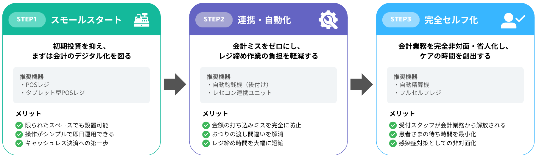その後、患者数の増加に合わせて、段階的に機能を追加・拡張(後付けでの自動釣銭機導入、対応キャッシュレスブランドの拡充、セミセルフからフルセルフへの運用変更など)できる機器を選べば、無駄のない投資で確実な費用対効果を得やすくなります。