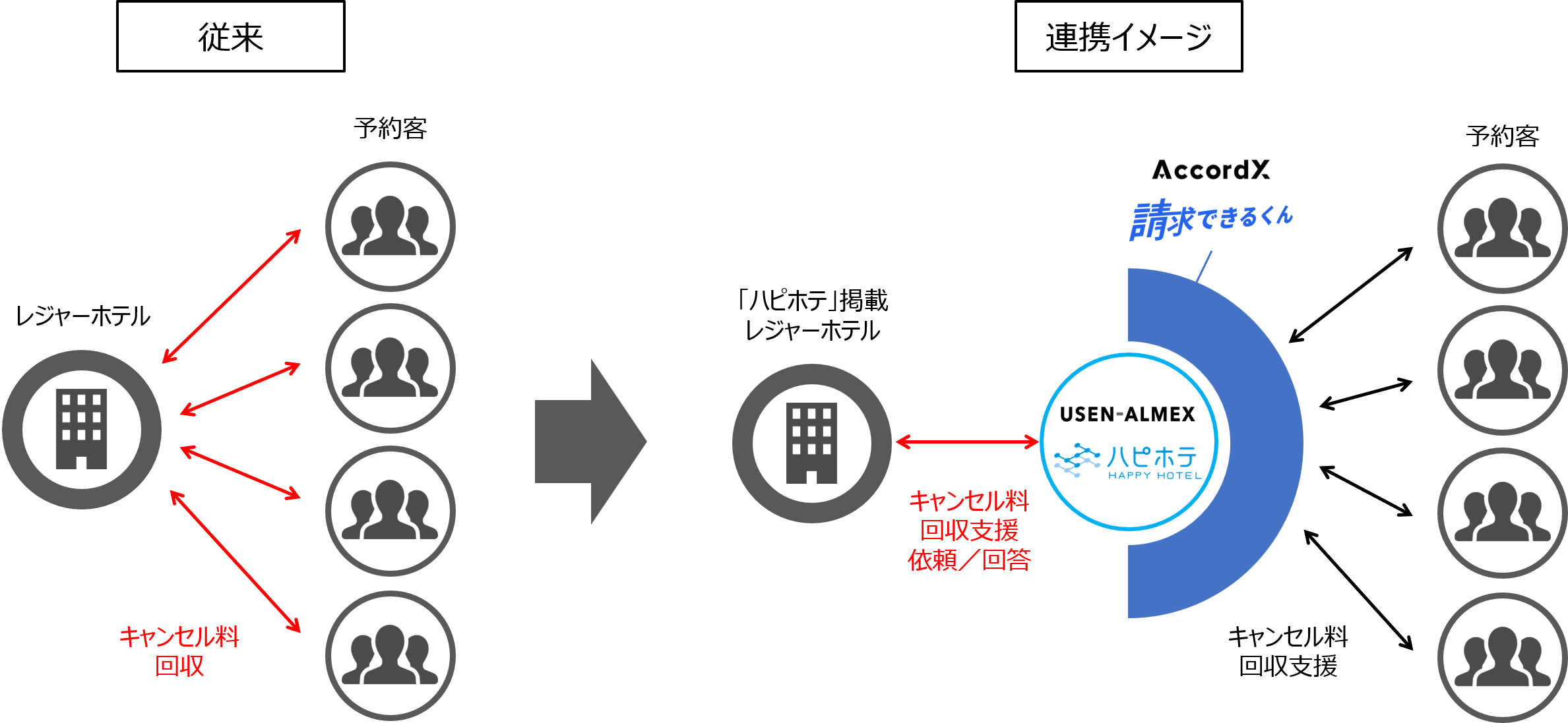 USEN-ALMEXの「ハピホテ」を通じて成立した予約において発生したキャンセル料金を、USEN-ALMEXがAccordXの「請求できるくん」を通じて、本来レジャーホテルが自ら実施しなければならないキャンセル料金の収納を支援します。